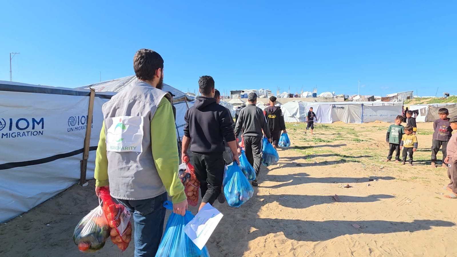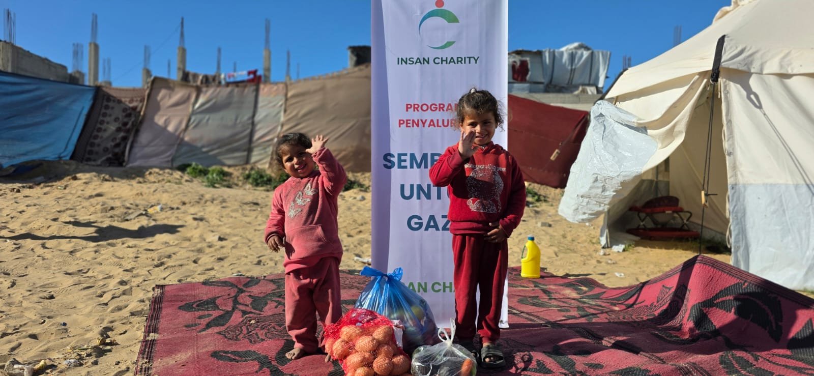 5 Februari 2026. Di antara tenda-tenda pengungsian di Selatan Jalur Gaza, anak-anak berdiri memegang kantong plastik berisi sayuran. Isinya sederhana: kentang, bawang, tomat, dan kebutuhan dapur dasar lainnya.