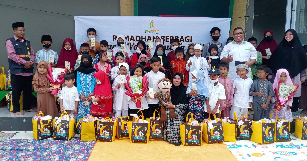 Pada hari lain, puluhan anak berkumpul di depan backdrop bertuliskan “Ramadhan Berbagi”.